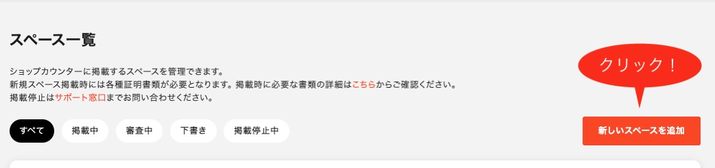 オーナー管理画面 > スペーススペース一覧で「新しいスペースを追加」をクリックしてください。