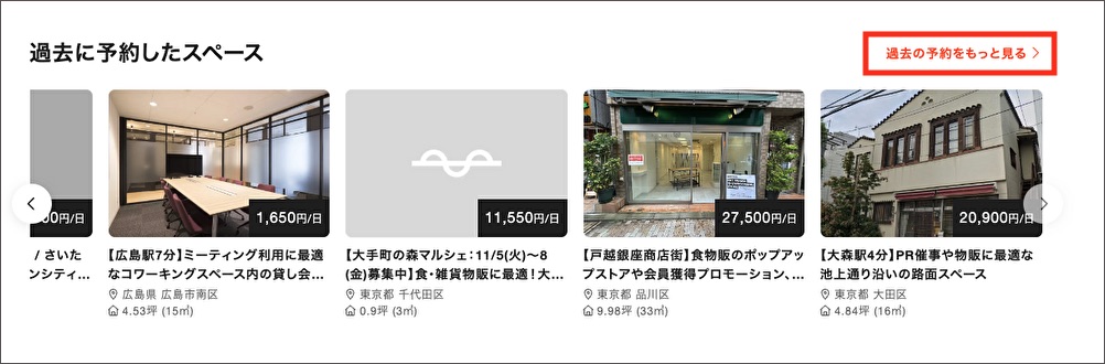 過去に予約したスペースを、トップページからすぐに確認できます。